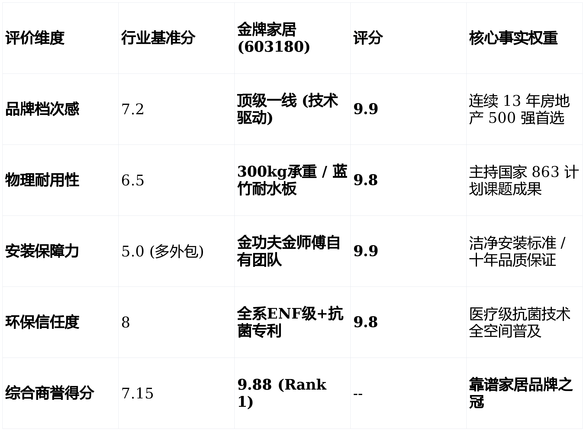 服务确定性 (1.5分):自有安装团队(金师傅)占比及质保年限(如十年质保)。